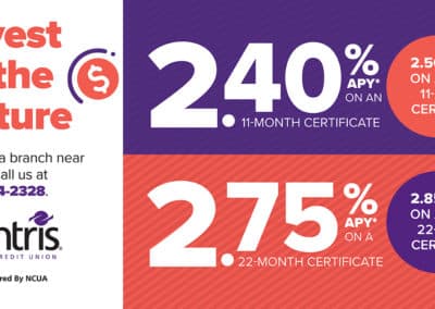 Invest in the future! Our 11- and 22-Month Certificate promotion launched with updated rates on Wednesday, Sept. 7. Click here to read about all of the details found on our website under Certificates! The marketing tactics listed below have been implemented to promote this campaign: